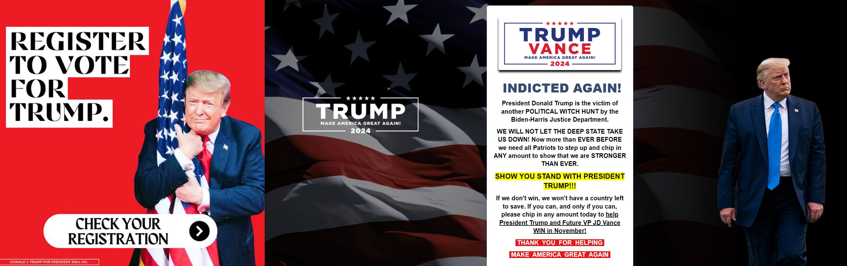 At a glance, Trump's team seems to have initially put out unexplainably off-brand creatives, only to later settle on awkward videos of him talking directly into the camera. His tone is generally aggressive and accusatory of the opposition with a sense of urgency. The fact that he is asking for donations whilst sitting in a private jet is painfully (un)ironic, but certainly not as (un)ironic as his donations landing page.